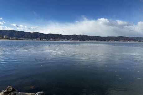 諏訪湖のほとりにたたずむ