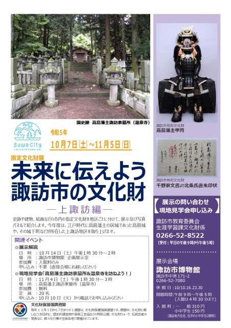 諏訪市博物館において指定文化財展「未来に伝えよう諏訪市の文化財ー上諏訪編」を開催中です。