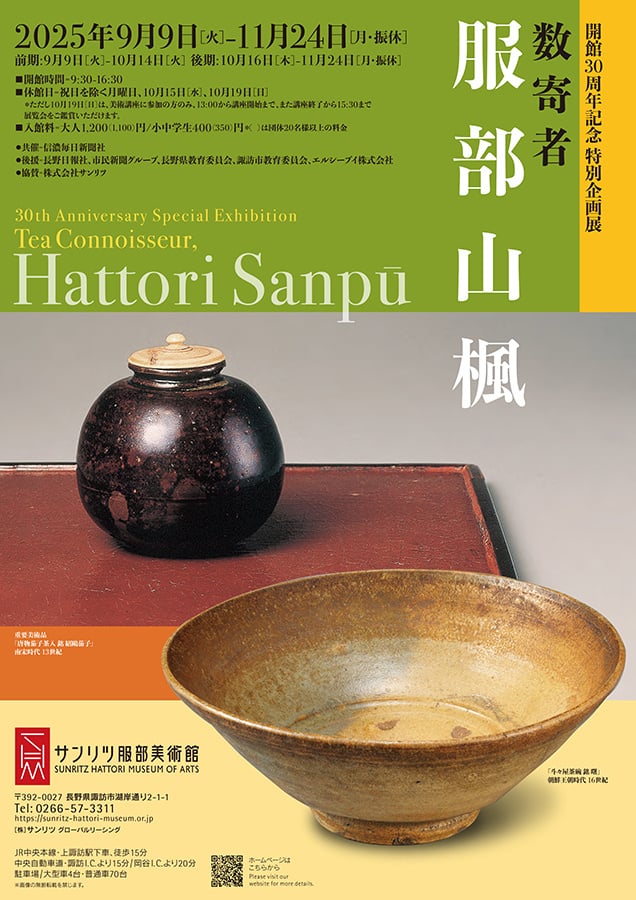 これを記念し、サンリツ美術館の茶道具コレクションの礎を築いた数寄者・服部山楓(はっとりさんぷう)に焦点を当てた特別企画展が開催中です。前後期合わせた約60点に及ぶ山楓ゆかりの作品が展示されています。