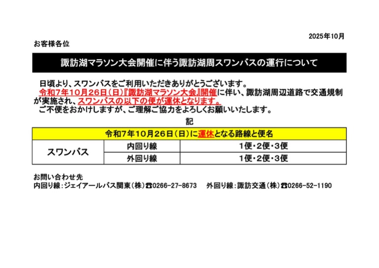 スワンバス内・外回り線 1~3便運休、4便より通常通り運行します。