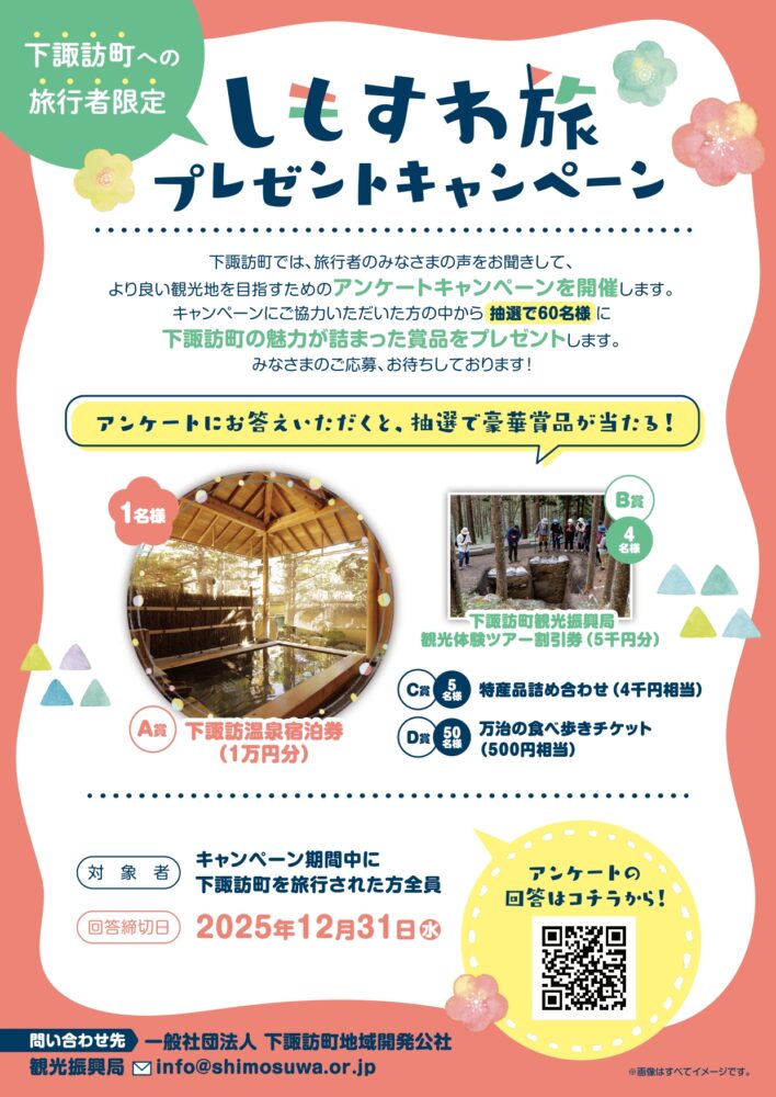 キャンペーン期間中に下諏訪にご旅行にいらっしゃった方も、12月31日までに下諏訪にご旅行にいらっしゃる方も応募されてみてはいかがでしょうか。