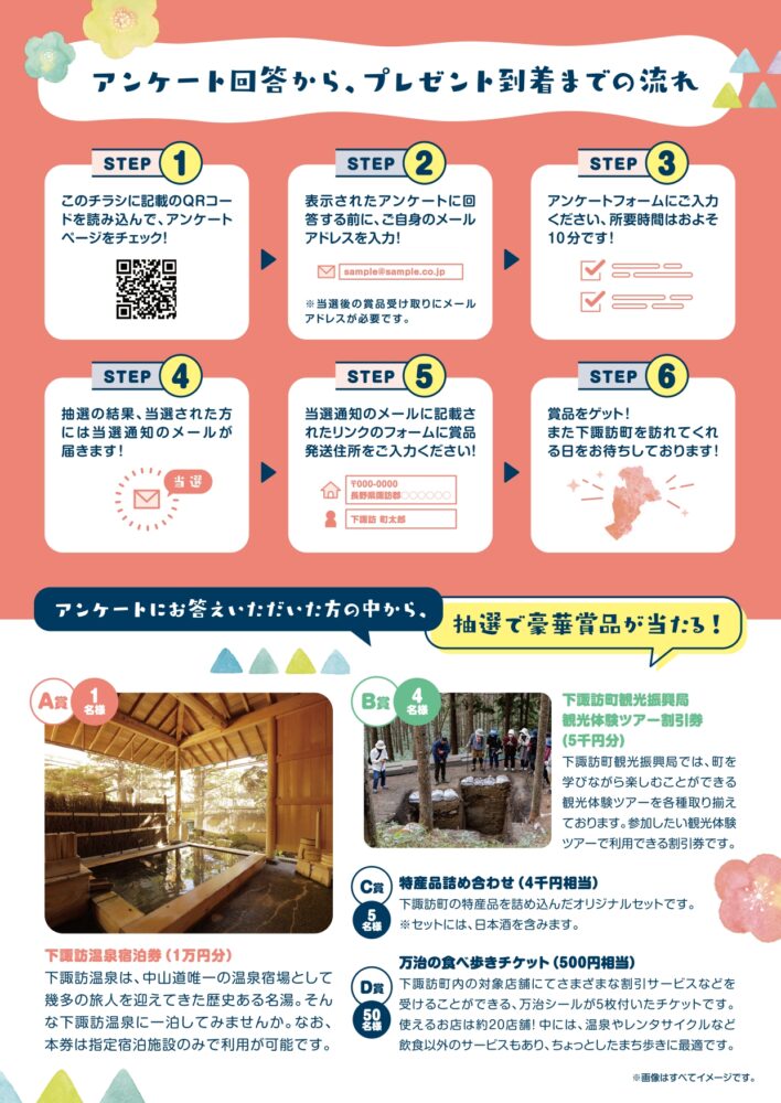 キャンペーンにご協力いただいた方の中から 抽選で60名様 に下諏訪温泉宿泊補助券や特産品の詰め合わせなど、下諏訪町の魅力の詰まった賞品がプレゼントされます。