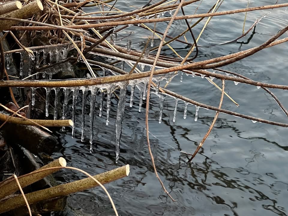 本日は、湖面は波が揺らめいておりましたが、湖面近くの枝にはしぶき氷がちらほらとできておりました。