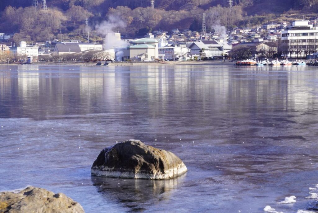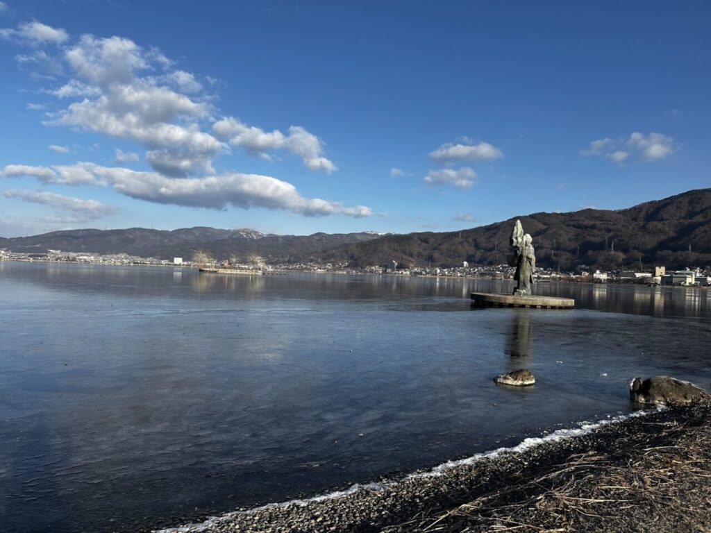 昨日今季初のほぼ全面結氷となった諏訪湖の今朝の様子です。