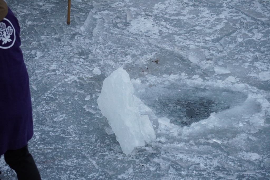 本日も気温はマイナス8度と冷え込み、岸の寄せ氷は18センチほどの厚さで結氷しているものの、諏訪湖全体的を見渡すと凍っている部分が減っておりました。