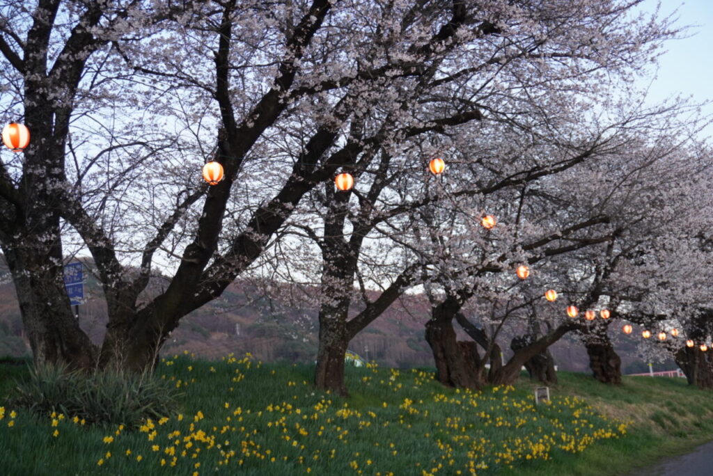 水仙の黄色と桜の薄紅色のコントラストが見事な桜並木。